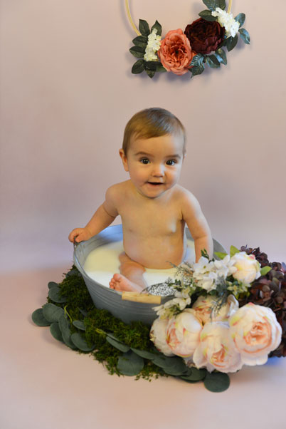 La séance photo en studio dès que bébé tient assis dans un joli bain de lait. Décors, tenues, accessoires pour le bébé sont mis à disposition.